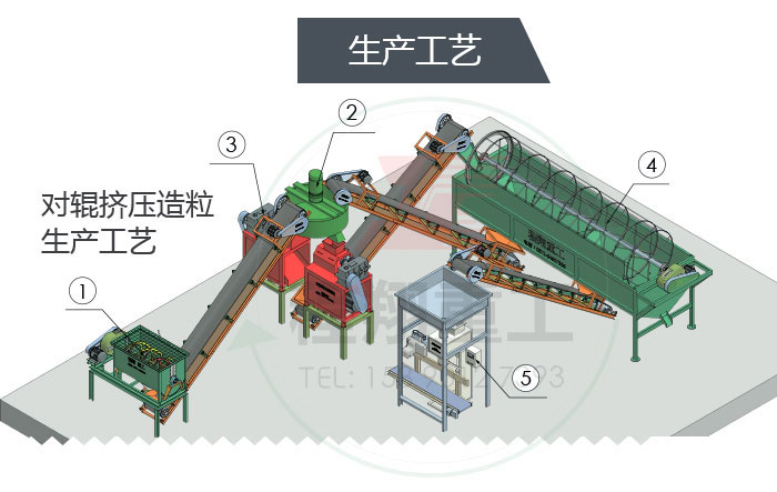 對輥擠壓造粒機(jī)生產(chǎn)線每年可加工2萬噸的硫酸鉀復(fù)合肥料,該復(fù)合肥生產(chǎn)線主要設(shè)備有:對輥擠壓造粒機(jī)、盤式喂料機(jī)、滾筒篩分機(jī)以及臥式攪拌機(jī)、自動包裝秤等。