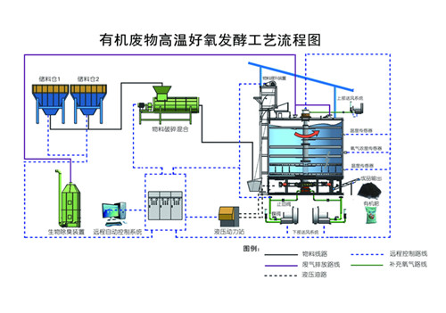 有機肥發(fā)酵罐好氧發(fā)酵工藝流程為:物料收集(秸稈、糞便)——混合攪拌——發(fā)酵罐好氧發(fā)酵,具體的工藝流程如下圖所示: