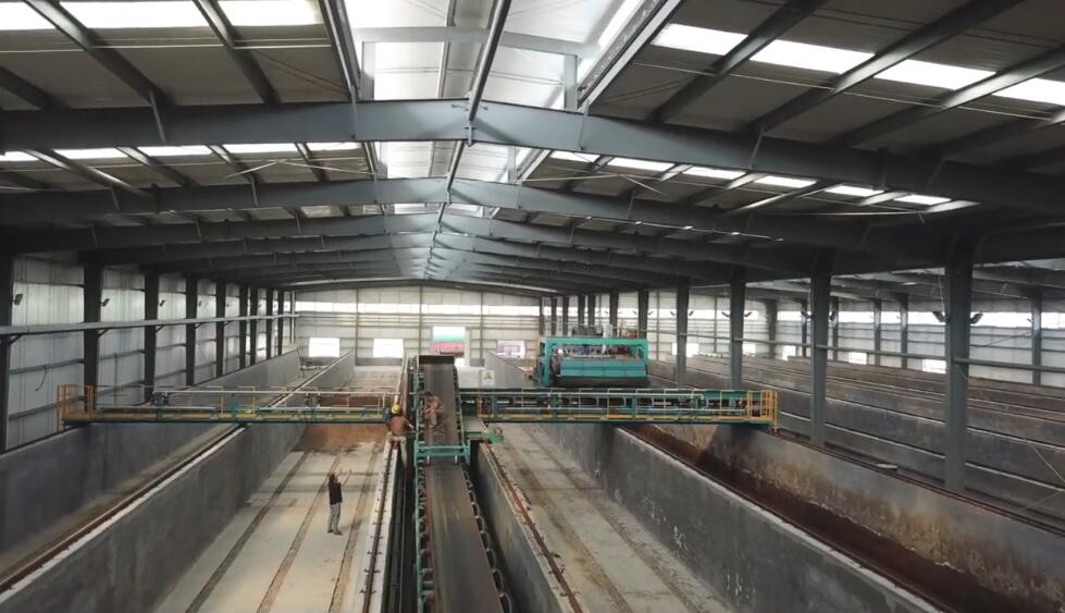 使用槽式翻堆機對條堆進行翻拋。溫度升到55℃以上,每隔1~2天翻堆一次,55℃發(fā)酵10~15天后,將條堆收起即可。(翻堆的目的是促進水分蒸發(fā)、促進氧氣進入堆體內(nèi)部、促進菌種進入堆體內(nèi)部并迅速繁殖和發(fā)酵)下圖為帶提升式的槽式翻拋機,可以調(diào)動翻堆高度,同時縮短翻堆回程速度。