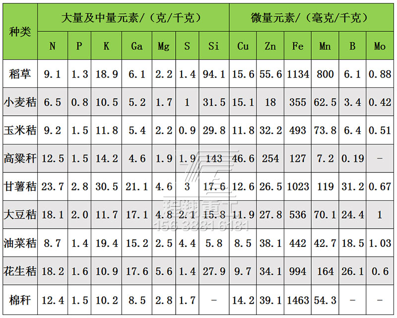 秸稈中含有大量的有機質(zhì)和氮(N)、磷(P)、鉀(K)、鈣(Ca)、鎂(Mg)、硫(S)、硅(Si)、銅(Cu)、錳(Mn)、鋅(Zn)、鐵(Fe)、鉬(Mo)等營養(yǎng)元素,主要作物秸稈的營養(yǎng)元素含量見表1。
